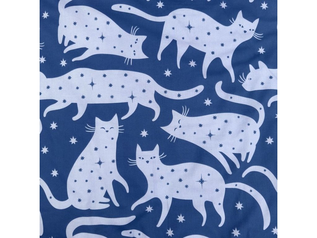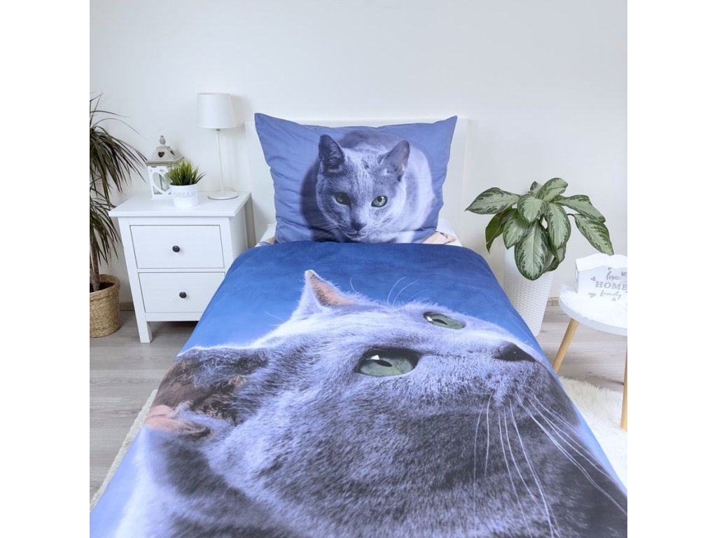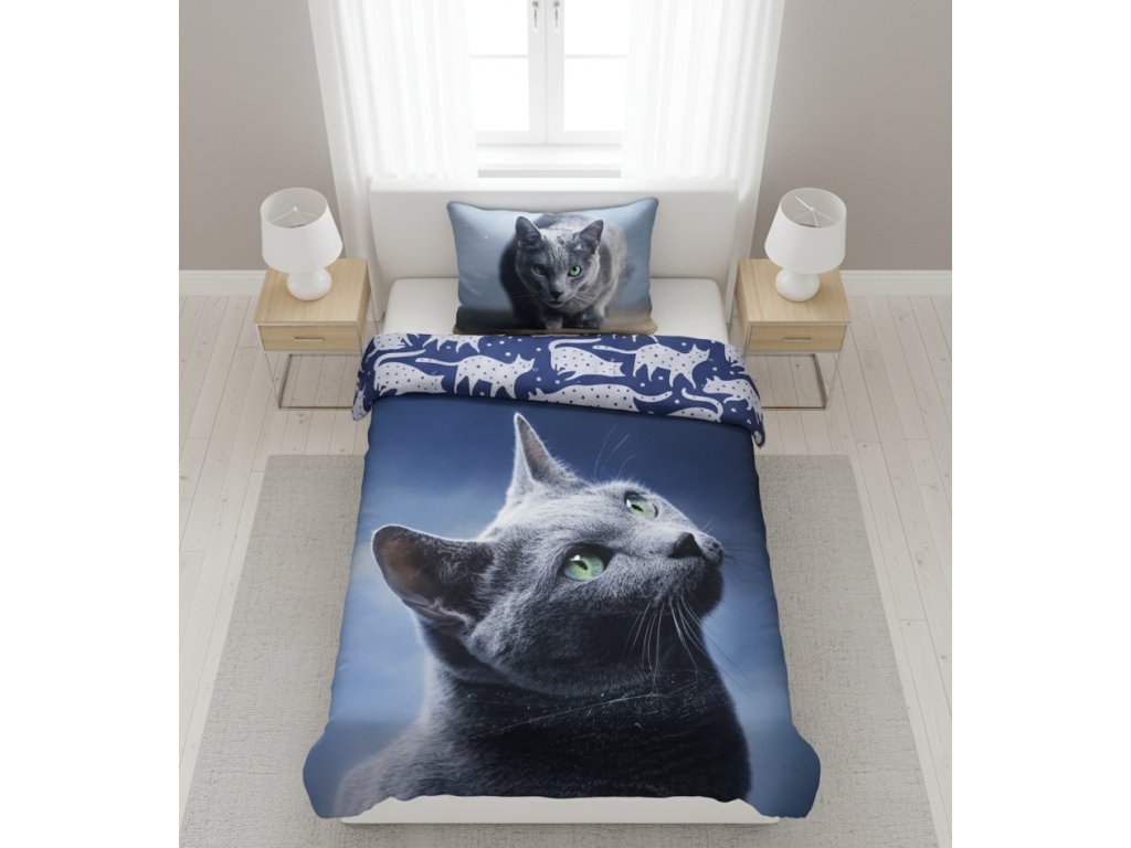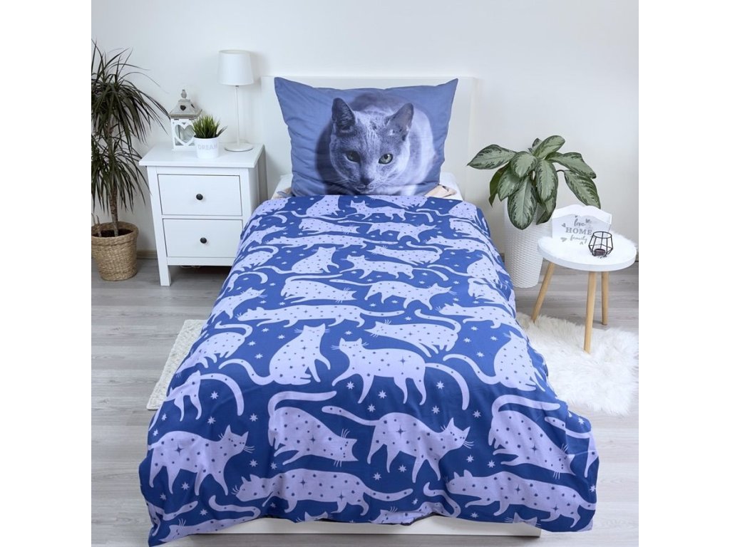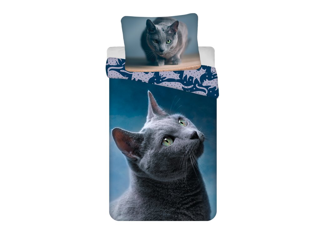 Design je velmi působivý: fototisk elegantní šedé kočky s pronikavě zelenýma očima na tmavě modrém až černém pozadí. Polštář a okraj peřiny doplňuje menší dekorativní vzor siluet koček a hvězd.