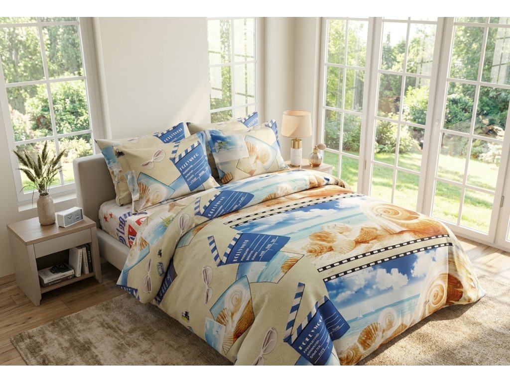 Přeneste se na slunnou pláž doprovázenou filmovou estetikou! Toto 3dílné povlečení kombinuje motivy mořských mušlí, písku a ikonických filmových klapek s filmovým pásem. Je to perfektní volba pro ty, kteří milují léto, cestování a atmosféru stříbrného plátna.