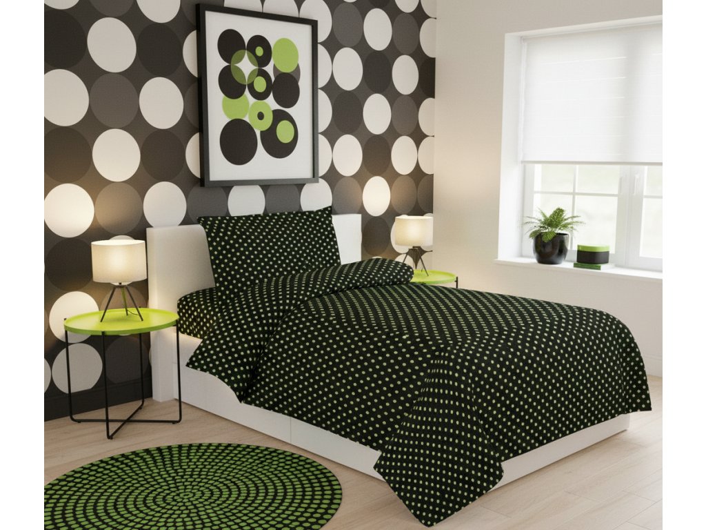 Design povlečení je velmi výrazný: drobné neonově zelené puntíky jsou pravidelně rozmístěny na tmavém (černém) podkladu. Vzor vytváří poutavý vizuální dojem hloubky a struktury.