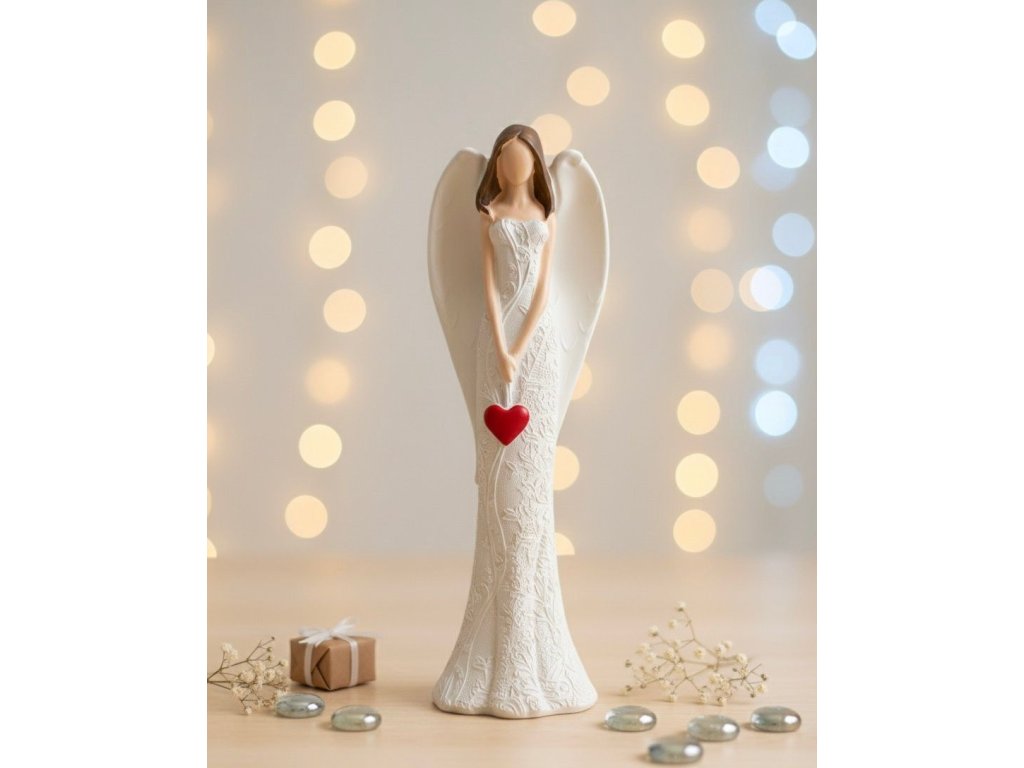 Nechte se okouzlit touto něžnou dekorativní figurkou, která v sepjatých rukou drží zářivě červené srdce ❤️. Je ztělesněním lásky, něhy a ochrany 🙏 a vnese do vašeho domova klidnou a hřejivou atmosféru. Působí étericky a elegantně, dodávajíc prostoru pocit harmonie.