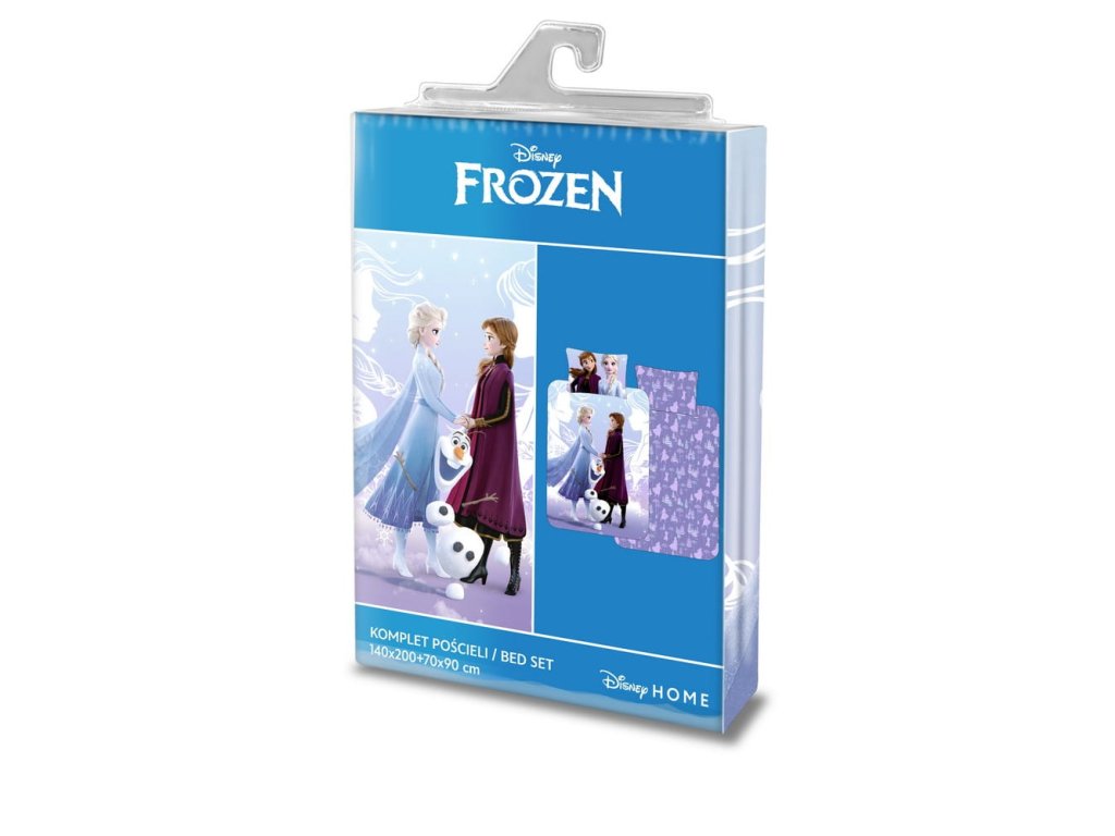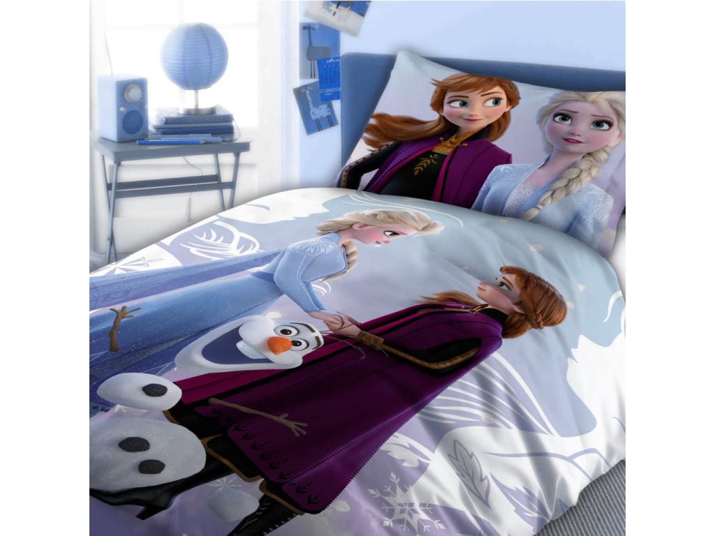 Na povlečení jsou vyobrazeny Elsa a Anna, které se drží za ruce, a vedle nich radostný Olaf. Celý design je laděn do pastelových odstínů fialové a modré, doplněných o zimní motivy sněhových vloček. Povlečení má praktické zapínání na zip.