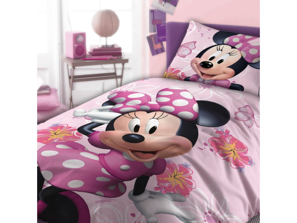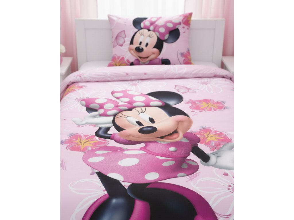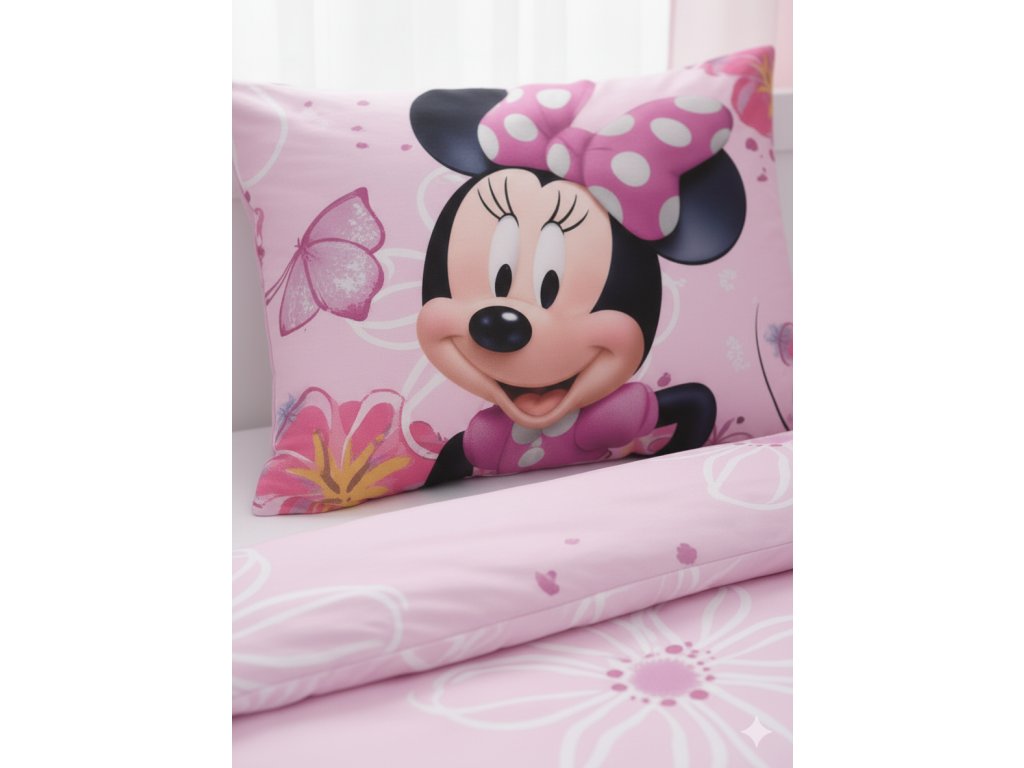 Povlečení dominuje velký obrázek Minnie Mouse v ikonických puntíkatých šatech a s mašlí, na růžovém pozadí s jemnými květinami a motýlky. Povlečení má praktické zapínání na zip pro snadnou údržbu.