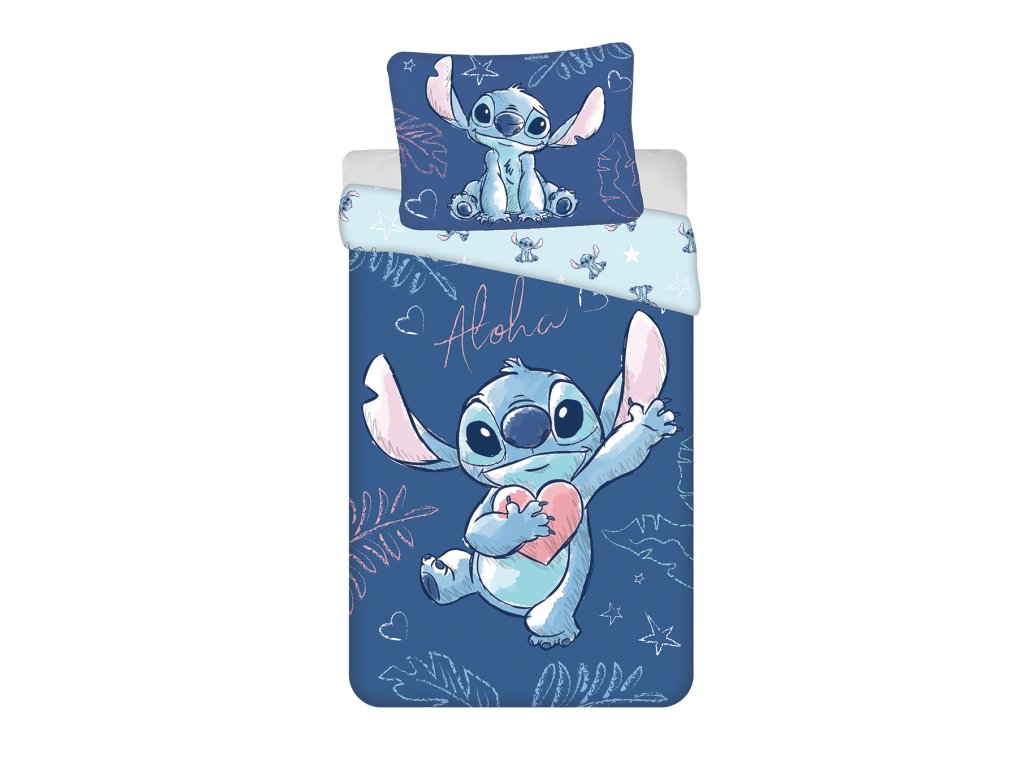 Přeneste se do světa "Aloha" s tímto 2 dílným povlečením DISNEY STITCH! Roztomilý mimozemský hrdina Stitch objímající srdce s nápisem "Aloha" na tmavě modrém pozadí je ideální pro fanoušky a zajistí ty nejsladší sny.