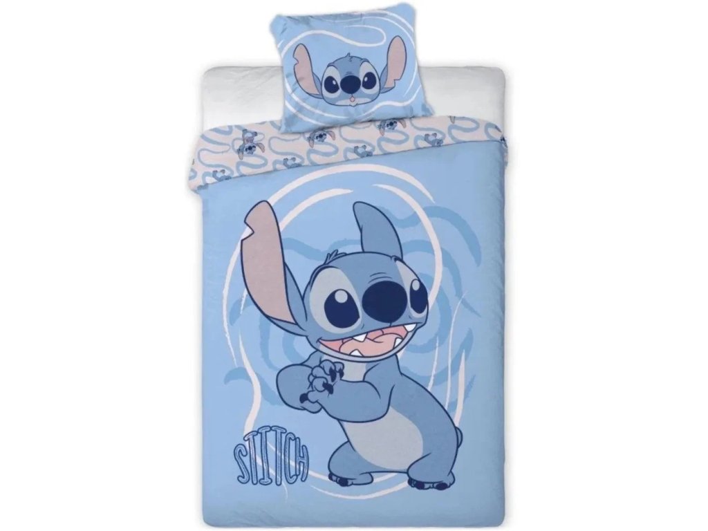 Lícní strana: Zdobí ji velký obrázek Stitche na modrém podkladu s hravým vířivým vzorem.