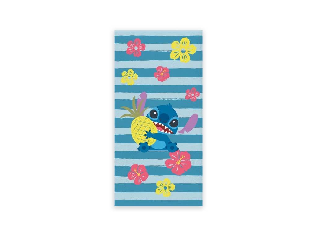 Dopřejte svým dětem radost z koupání s touto veselou osuškou s motivem populární postavičky Stitch. Design zachycuje usměvavého Stitche objímajícího ananas na modrém pruhovaném pozadí, které je stylově doplněno růžovými a žlutými květy ibišku. Tato barevná osuška okamžitě navodí letní atmosféru, ať už jste u bazénu, na pláži nebo doma v koupelně.