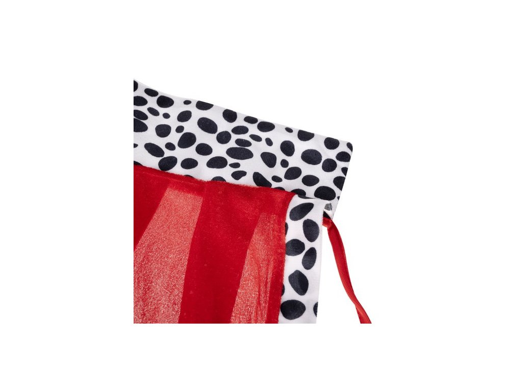 Majestátní plášť: Centrální prvek kostýmu v hluboké červené barvě, vyrobený z kvalitního materiálu příjemného na dotek. Je lemován černo-bílou umělou kožešinou pro vznešený vzhled a díky dlouhým popruhům se snadno připevňuje k ramenům.