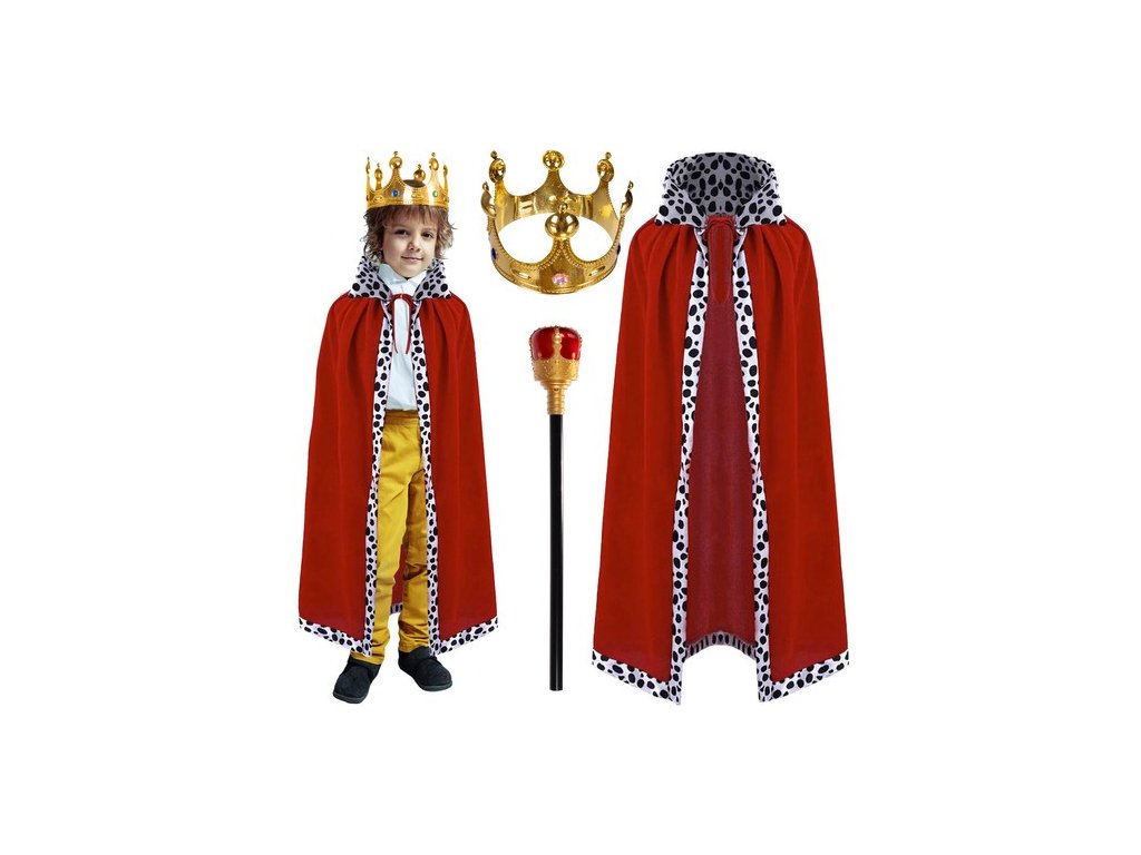 V tomto královském kostýmu s pláštěm, žezlem a korunou je nemožné necítit se jako skutečný monarcha. Kombinace splývavého pláště, majestátního žezla a bohatě zdobené koruny vytváří auru autority, elegance a vznešenosti. Tyto královské atributy umožní každému nositeli vžít se do role krále a vzbudit zájem i respekt všude, kde se objeví.