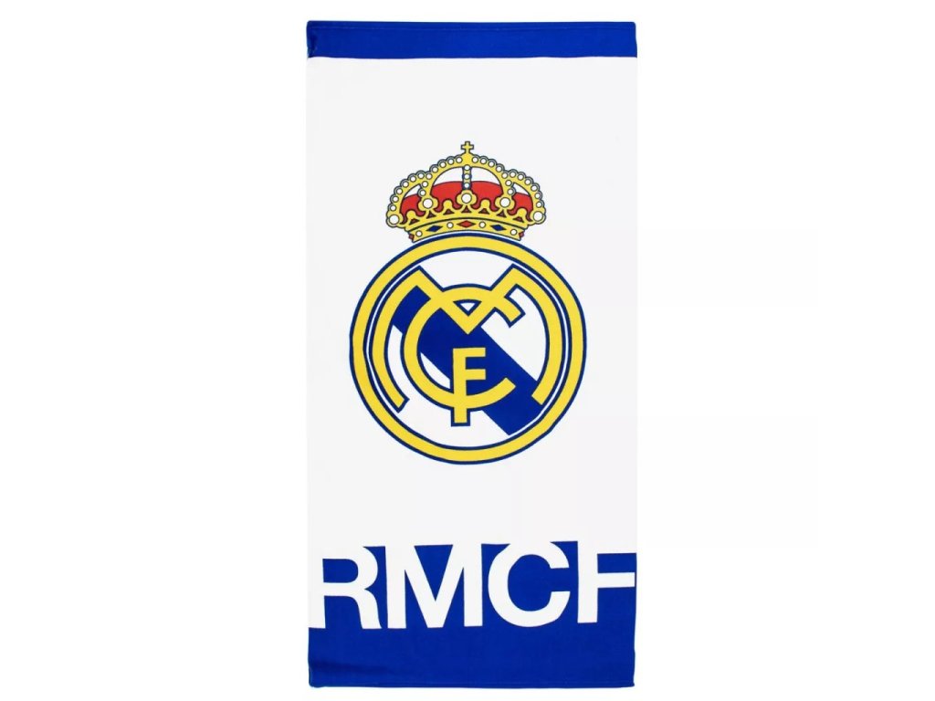 Oficiální design: Osušku zdobí velký a výrazný oficiální znak Real Madrid (koruna a logo), doplněný velkými písmeny "RMCF" . Dominují barvy klubu – bílá a královsky modrá .