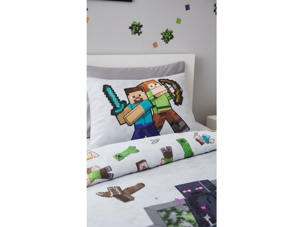 Licencované povlečení MINECRAFT ATTACK je nezbytností pro každého fanouška světa kostiček! Díky dynamickému motivu s oblíbenými hrdiny Alexem a Stevem a ikonickými moby, jako je Creeper a Enderman, promění pokoj v bezpečné útočiště pro klidný odpočinek po náročném dni plném stavění a boje.