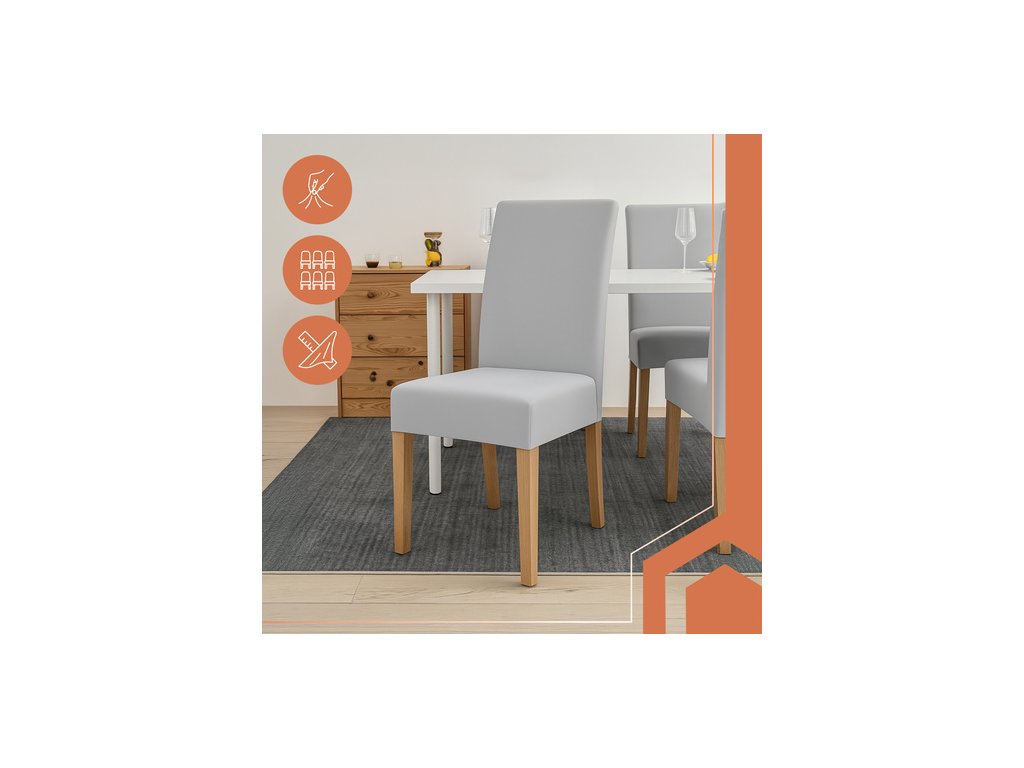 Potahy jsou vyrobeny z měkkého, pružného veluru s vysokou elasticitou. Díky všitým elastickým pásům potahy stabilně sedí na židli a přizpůsobí se jejímu tvaru. Hustá a odolná látka účinně zakryje veškeré nedokonalosti a není průhledná.