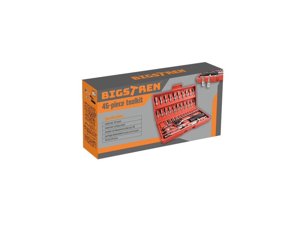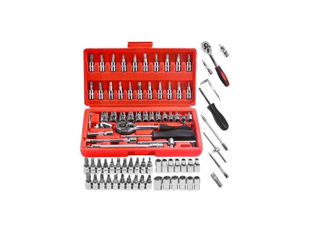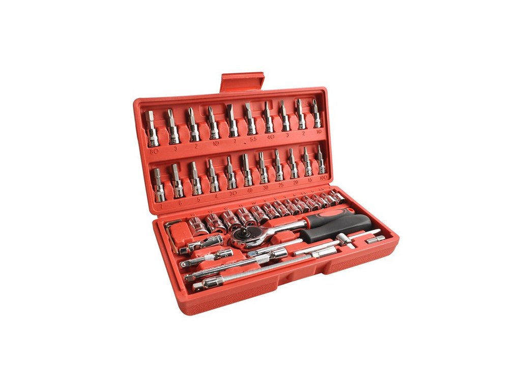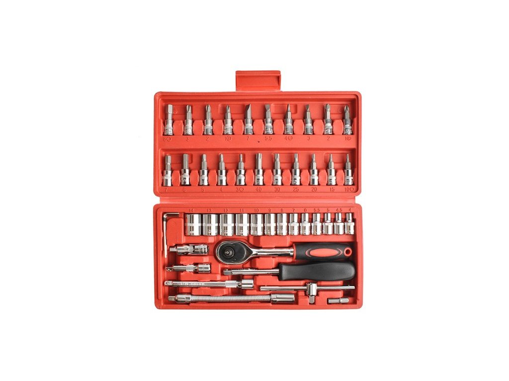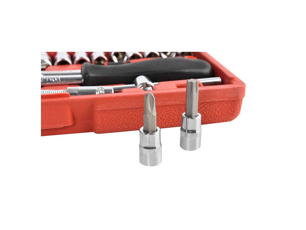 Kompletní 46dílná výbava – Obsahuje nejčastěji používané nástrčné hlavice (4–14 mm), různé typy bitů (TORX, HEX, ploché, křížové), imbusové klíče, ráčnu s 72 zuby, prodloužení, flexibilní nástavec i univerzální kloub.