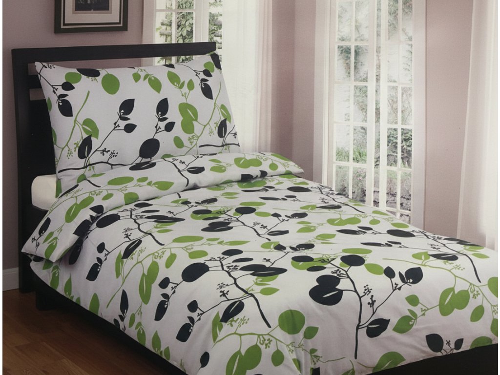 Design povlečení tvoří grafický vzor s větvičkami a lístky v kontrastní černo-zelené kombinaci na světlém podkladu. Tento moderní vzor se hodí do každého interiéru.