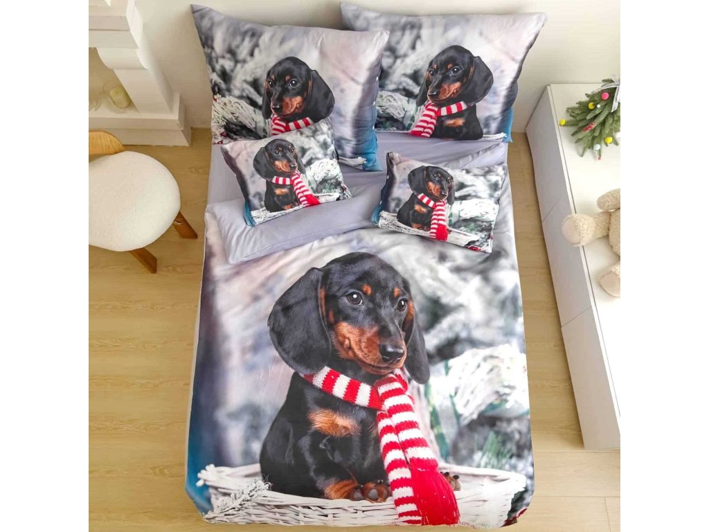 Krásné povlečení se zimní tématikou, buďte ,,IN" a vylaďte si ložnici dle aktuálního ročního období. Oboustranné provedení s 3D obrázkem jezevčíka se šálou/jednobarevné, světle šedé-vyberte si styl, dle své aktuální nálady. 3dílná sada povlečení na přikrývku 140x200cm, povlak na velký polštář 70x90cm a povlak na malý polštářek 50x40cm. Materiál mikrovlákno. Zapínání na knoflíky. Nepoužívejte prací prostředky s bělícími účinky. Dodržujte pokyny k údržbě dané výrobcem na štítku či obalu zboží.