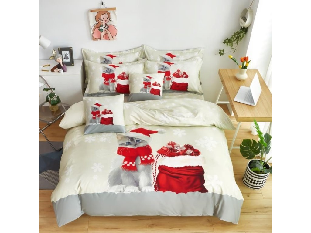 Světlé povlečení s 3D motivem kočky s dárky v krásném kontrastu barev krémové a červenédokonale doladí vánoční atmosféru vašeho domova. 3-dílná souprava se skládá z povlečení na peřinu 140x200cm, velkého polštáře 70x90cm a malého polštáře 40x50cm. Materiál je mikrovlákno. Zapínání je na knoflíky.