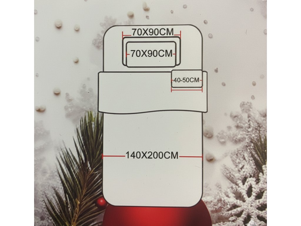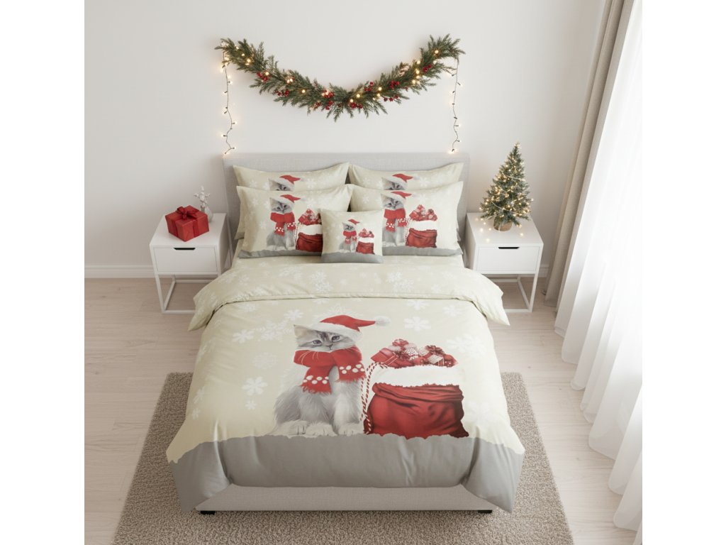 Povlečení zdobí rozkošná kočička v čepici a šále Santa Clause, která sedí vedle vánočního pytle plného dárků. Vše je umístěno na světle béžovém, zasněženém pozadí plném sněhových vloček, což dokonale evokuje poklidnou sváteční atmosféru. Motivy z polštářů doplňují celkový sváteční vzhled.