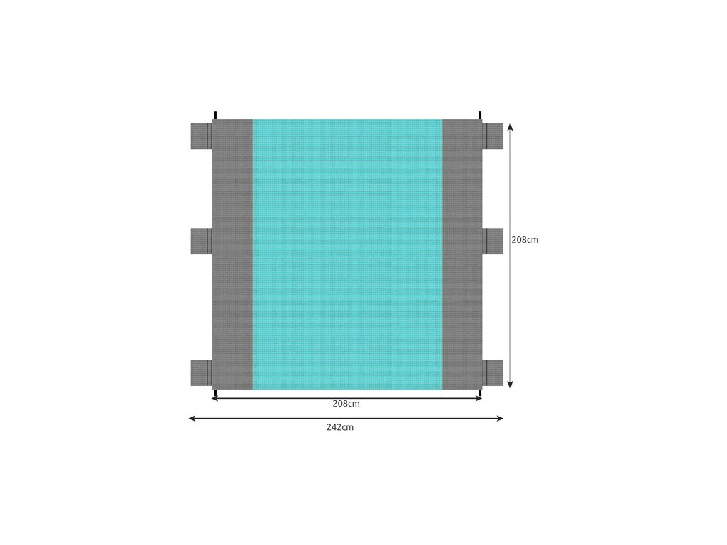 Kotvící systém: Pro maximální stabilitu na trávě nebo hlíně jsou součástí balení 4 kolíky, které snadno upevníte do poutek v rozích podložky.